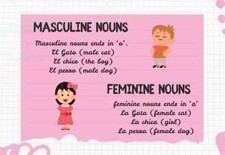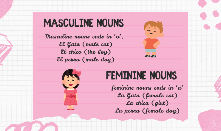In Spanish, nouns have gender which does not mean they are feminine or masculine physically, but in a grammatical sense. There are two types of nouns in Spanish, masculine nouns and feminine nouns.